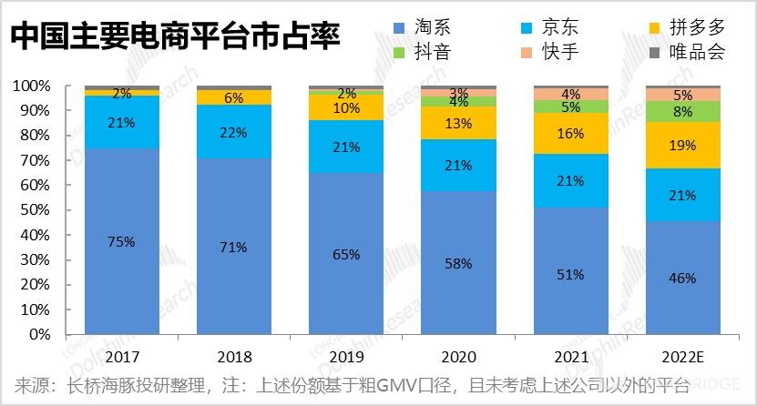 1)据权威机构的预测,防疫放松后,中国 GDP 未来几年的中枢增速会恢复到 5% 上下,在基于国内商品零售和宏观经济增长间的历史相关性。海豚君测算出中期内国内线上商品零售的中枢增速会在 11% 左右,相比 2022 年 6% 的增速会明显反弹,但也仅是 "L" 型复苏,即增速虽会企稳,再难恢复到 2019 年前 20% 以上增速的 " 黄金时代 "。未来各电商平台的增长也会围绕着这个新的中枢,展开你进我推的争夺。