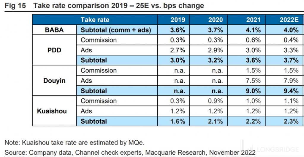 根据调研统计,抖音直播电商收取的整体变现率(佣金 + 广告)高达 9% 以上,远超出传统电商平台 3%~4% 的整体变现率。其中,抽取的佣金率仅有 1.5%,而广告变现率则达到了 7% 以上,可见商家在抖音平台上投放广告的意愿很强。