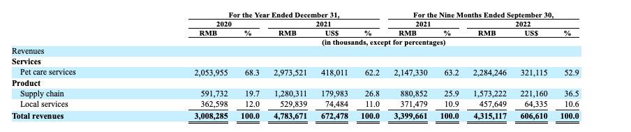 据招股书显示,新瑞鹏已经建立了一个涵盖宠物全生命周期的数字化宠物护理平台,将宠物护理服务、供应链服务和本地服务作为三大支柱,相互补充和协同。并在此基础上,扩展到其他业务领域,包括第三方诊断、持续兽医教育和市场营销服务,致力于建立世界一流的综合宠物服务平台及互惠整合的宠物生态系统。