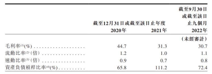 与此同时,优必选的偿债压力也在增加。截至 2021 年 12 月 31 日,优必选的流动比率为 1.0 倍、速动比率为 0.7 倍,比上一财年都出现下滑。资产负债杠杆比率达到 111.2%,比上一财年末大幅增加 45.4 个百分点。截止到 2022 年 9 月 30 日,其上述相关数据虽然有所缓解,但仍高于 2020 年末的水平。