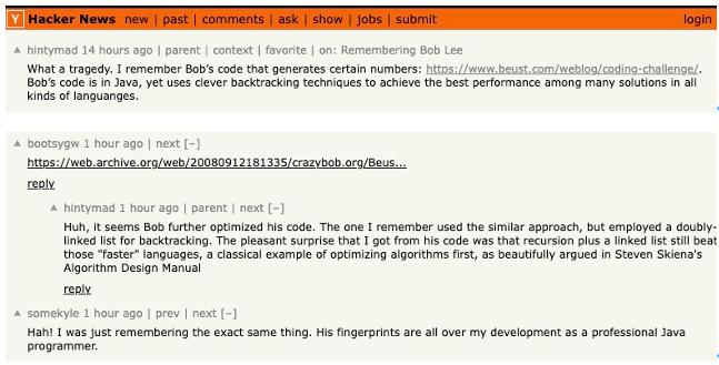 有人翻出了 2008 年 Bob 曾参与的一个代码挑战,指出当时 Bob 给出巧妙解法在众多答案中非常亮眼,很多 Java 开发者们也纷纷回帖表示当年 Bob 的技术能力给自己留下了深刻的印象,Bob 始终对技术有很大的热情,在已经提出足够好的解决方案之后还仍在不断改进优化自己的解法。
