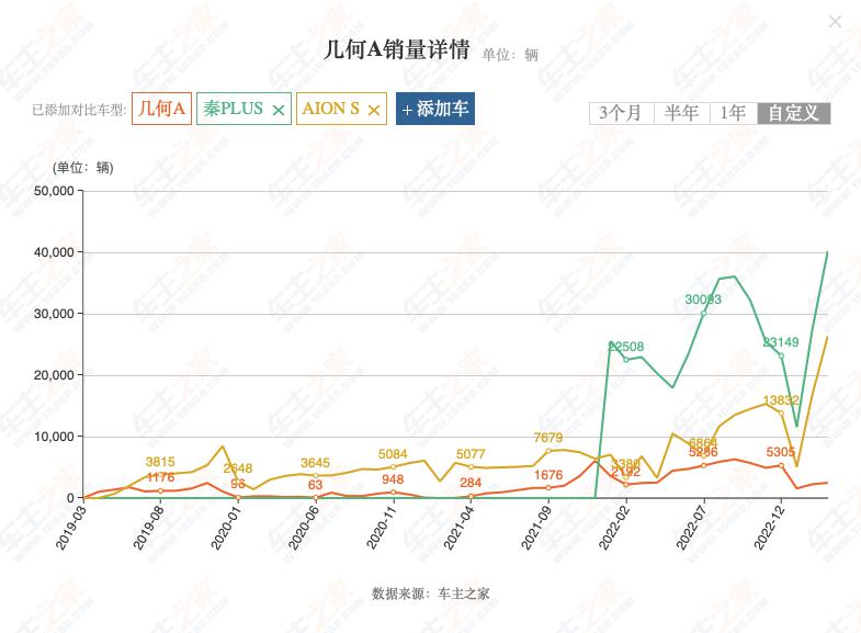 而与吉利新能源的整体表现类似,几何汽车也明显缺乏爆款车型。2022 年,几何汽车卖得最好的车型几何 A 全年销量仅 5 万辆左右,同期,埃安 S 全年销量已达到 11 万辆,历史累计销量超过 20 万辆,而出发最晚的竞品比亚迪秦 Plus 全年销量更超过 31 万辆。