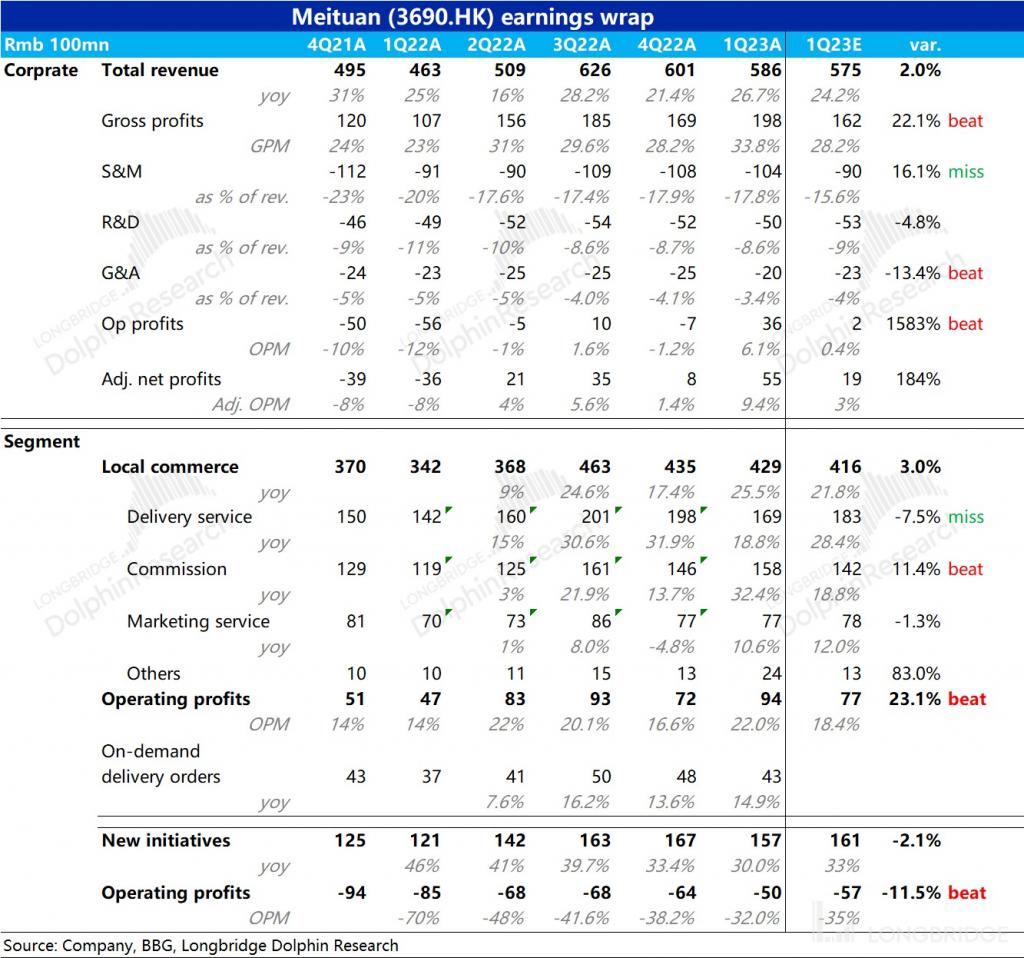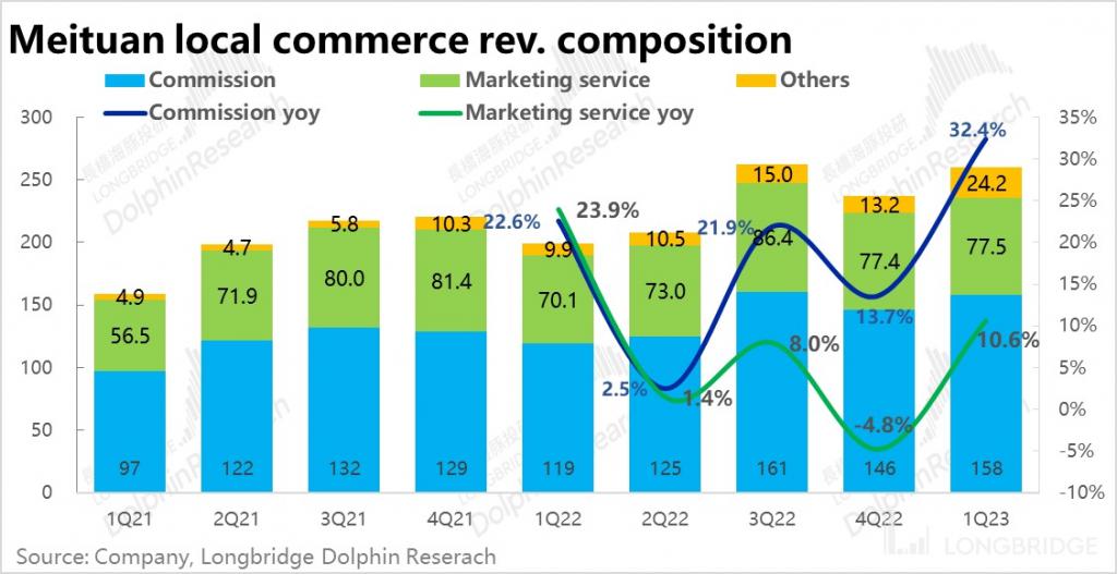 由于单量增速已被锚定,而一季度内国内居民出门旅游、就餐活动则复苏显著,海豚君认为,酒旅和到店业务的显著修复和外卖可能有提高变现是佣金收入超预期的主要原因。