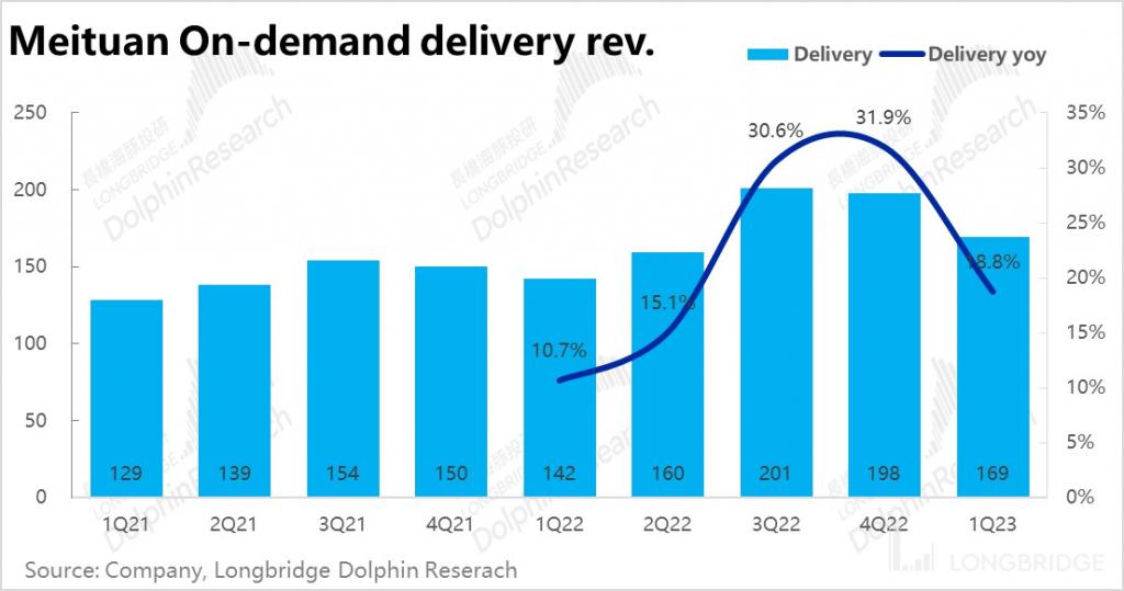 但本次财报的一大关注点在于:尽管即配单量增速在环比提升,公司自营配送收入的增长却显著下台阶。本季美团配送收入为 169 亿元,同比增速为 18.8%,显著少于市场预期的 183 亿。