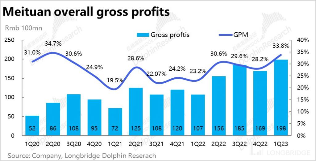 但毛利层面表现可谓爆炸,本季度实现毛利润 198 亿元,毛利率高达 33.8%,远超预期的 28%。一季度作为季节性的利润淡季,却实现了近历史最高的毛利率水平。海豚君认为,一是外卖小哥配送成本下降,二是酒旅到店业务等业务迅速修复,高毛利收入比重显著提升,应该是整体毛利率大幅提升的主要原因。