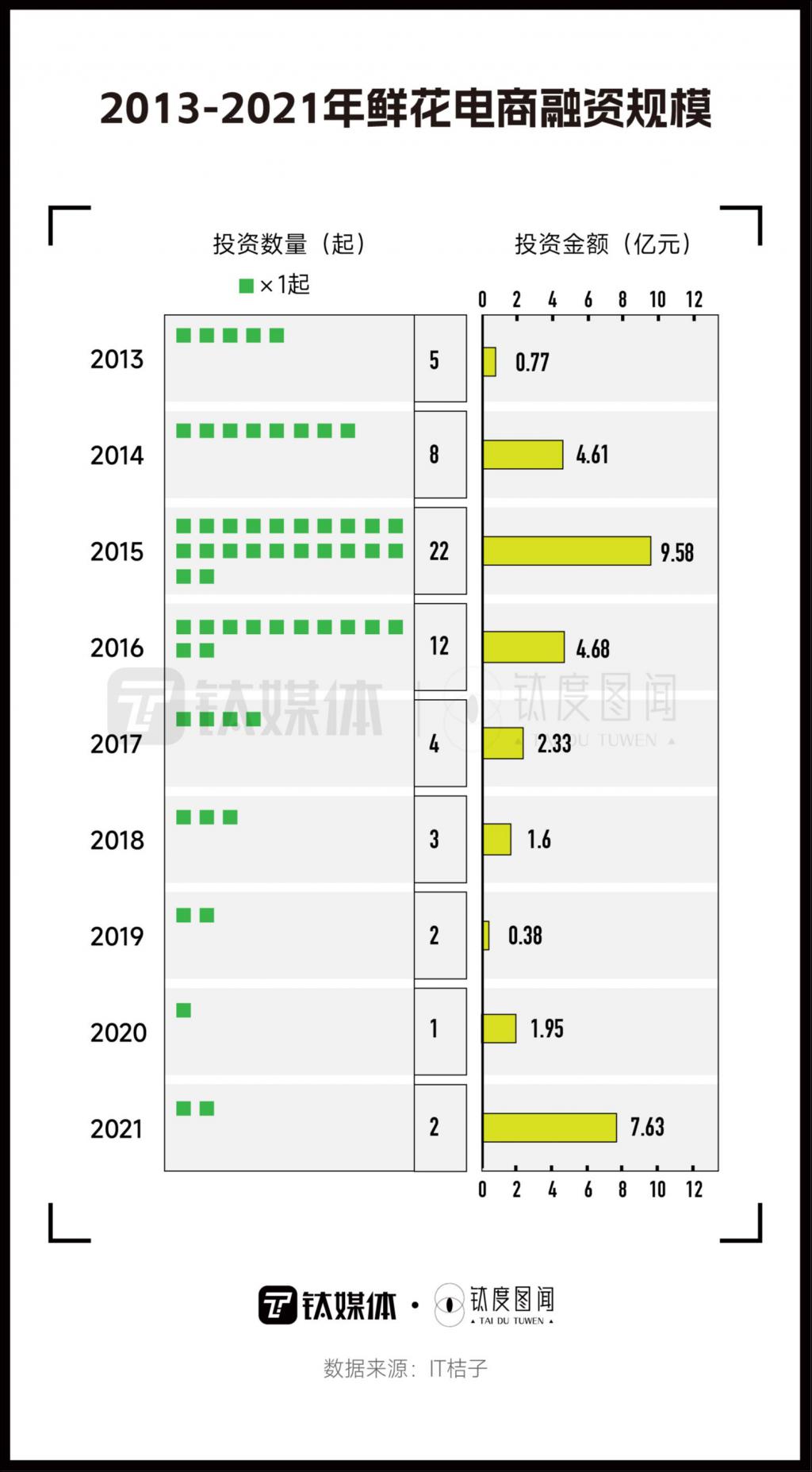 2017 年以后,成功获得融资的鲜花电商平台寥寥无几。2020 年以后,以盒马鲜生为代表的生鲜电商平台纷纷做起了鲜花生意。接着,以抖音直播间为代表的的鲜花直播也逐渐成为潮流,鲜花电商赛道又重新燃起了烽火。2021 年, 鲜花电商投资金额共 7.63 亿元,仅次于 2015 年的投资金额。