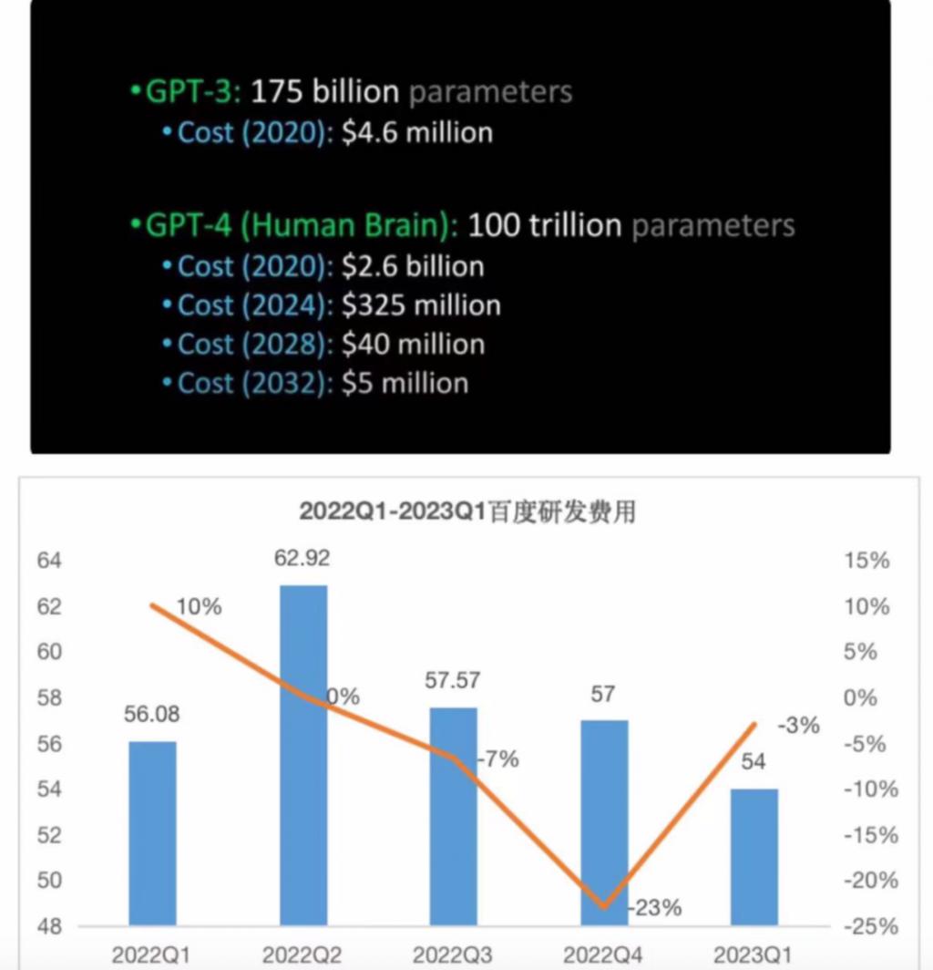 我们对比一下 GPT-4 的研发成本,2020 年估算为 26 亿美元,折合人民币 181 亿美元,这几乎是百度去年三个季度的研发费用,而百度作为上市公司在营收增速收缩的时候为了保证盈利能力还要进行一定的费用控制,因此研发费用的同比增速就从去年一季度的 10% 直降到今年一季度的 -3%。