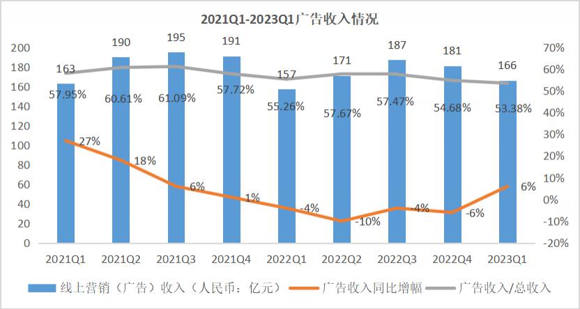 从 2021 年第一季度开始到 2023 年第一季度,百度的线上营销,也就是广告收益始终占比整体收入的 50% 以上。毫无疑问,广告,依旧是百度营收的支撑。