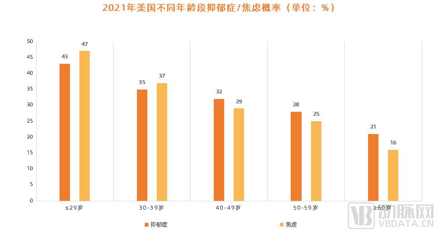 先从中美市场的共同点出发,首先感受到的是行业需求的激增,以美国为例,在美国人口普查局 2020 年 12 月进行的一项调查中,超过 42% 的参与者有焦虑或抑郁的症状,其比例比前一年大幅提升了 31%,受此趋势,美国 2021 年心理健康市场规模已经达到 450 亿美元。