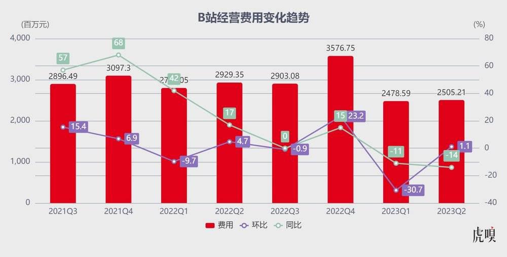 不妨将视线拉回 B 站 2023Q2 季度对费用的控制上:该季度经营开支总额为 25 亿元,同比减少 14%。其中,销售及营销费用同比减少 22%,管理费用同比下降 14%。