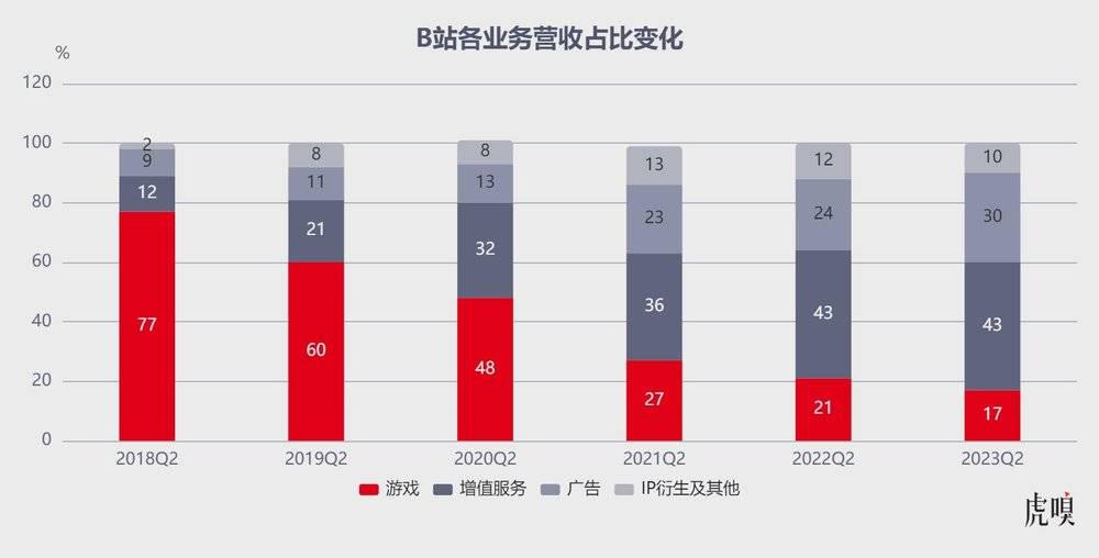 具体到业务贡献上:增值服务、广告、游戏、IP 衍生品及其他四块业务的整体营收占比分别为 43%、30%、17%、10%。