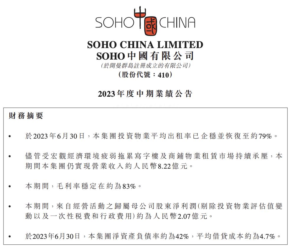8 月 18 日,SOHO 中国发布了 2023 年中期业绩公告,财报显示,截止 6 月 30 日,SOHO 中国的营业收入约 8.215 亿元,2022 年同期为 8.96 亿元;上半年毛利为 6.78 亿元,2022 年同期为 7.42 亿元;公司经营利润约 4.9 亿元,同比下降约 32.99%;净利润约 1470 万元,同比减少约 92.4%;归属于母公司股东净利润人民币 1361.3 万元,同比下降 92.86%;毛利率为 83%……