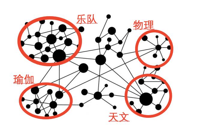 通常我们认为,一个互联网产品用户越多,价值就越大,但真实世界存在的网络并不是一个规则的结构,而是像下图一样规模不一,呈群落状的结构,比如家庭、学校、共同兴趣的圈子是相对紧密的结构,而不同喜好、背景并且缺乏已有关系链的用户很难短时间建立起来关系,没有关系也就没办法触发网络效应,因此,即使如 Meta、字节等流量运营专家,此前选择简单粗暴流量导入的方式扶持新产品,也很难成功。