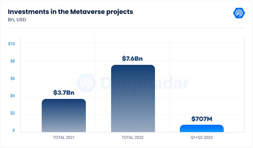 过去几年," 元宇宙 " 算得上是资本市场的 " 香饽饽 "。财联社创投通、IT 桔子《2022 年全球元宇宙投融资报告》称,仅 2022 年,全球元宇宙产业共发生 704 笔融资,总金额达 868.67 亿元,其中中国(包括港澳台)125 起、融资总额 127.82 亿元。那 2023 年呢?虽然全球范围的元宇宙融资半年报尚未出炉,但根据数据采集和分析公司 DappRadar 最新的报告,自 2023 年年初至 6 月底,基于 Web3 的元宇宙项目完成了融资总额约为 7.07 亿美元,不及 2022 年全年的 10%,似乎有遇冷则冷的迹象。