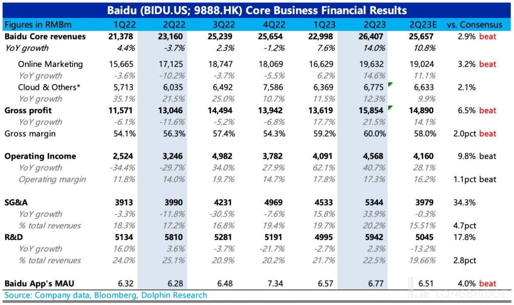 二季度广告亮眼,下半年有望保持或加速。二季度百度核心广告在低基数上,回暖幅度(同比 14.6%)比机构预期(12% 左右)得更好。