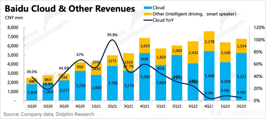百度的智慧云中,有不少是与地方政府合作的智慧交通解决方案收入。在近三年由于地方政府举债变难,规模萎缩,因此今年以来也削减了这类 " 锦上添花 " 型的城市基建。因此二季度智慧云增速继续放缓至 5%,海豚君预计智慧交通的项目需求可能会继续疲软。