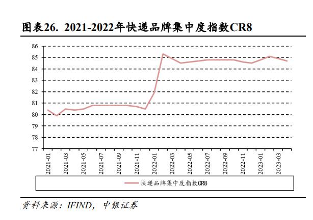 中银证券的数据显示,到 2022 年底,快递品牌集中度指数 CR8 已经接近 85%,换句话说,竞争对手已经没有虾兵蟹将,都是有市场地位的企业,仗必然越来越难打。