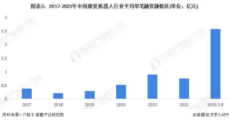 从平均单笔融资额来看,2017-2022 年,中国康复机器人行业平均单笔融资额整体呈上升的发展趋势,2021 年平均单笔融资额达到 0.91 亿元,达到近几年的峰值。2022 年平均单笔融资额为 0.76 亿元,同比下降 16.19%;2023 年 1-8 月,平均单笔融资额飞速提升,达到 2.58 亿元。