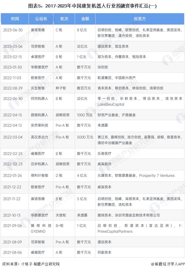 根据 IT 桔子数据库,从 2020 年开始,康复机器人行业投融资逐渐爆发,行业投融资风口确立,资本迅速涌入。2021 年,中国康复机器人行业融资金额达到峰值,为 9.96 亿元,同比增长 221.29%;2022 年,中国康复机器人行业共发生融资事件 9 起,融资金额为 6.83 亿元,热度有所减退。2023 年 1-8 月,中国康复机器人行业共发生融资事件 4 起,融资金额为 10.3 亿元。
