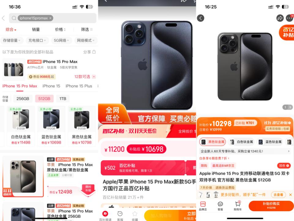 在 iPhone15Pro Max 的补贴上,京东力度最大,512GB 黑色为 10298 元,拼多多同色同内存价格为 10798 元,天猫同内存最便宜的蓝色也达到了 10698 元。