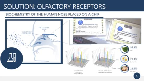 一家专注于 " 将香气和味觉数字化 " 研发的创业公司 Aromyx ,该公司的主要产品是名为 EssenceChip 的传感器,这是一种能够将人类嗅觉和味觉感官以数字读数输出的生物芯片。