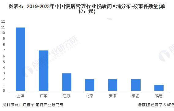 从行业企业融资区域来看,近年来全国慢病管理行业投融资事件集中上海、广东、江苏、北京、安徽、浙江和福建等省市,其中 2019-2023 年 11 月上海发生投融资事件数量为 11 起,居全国首位。