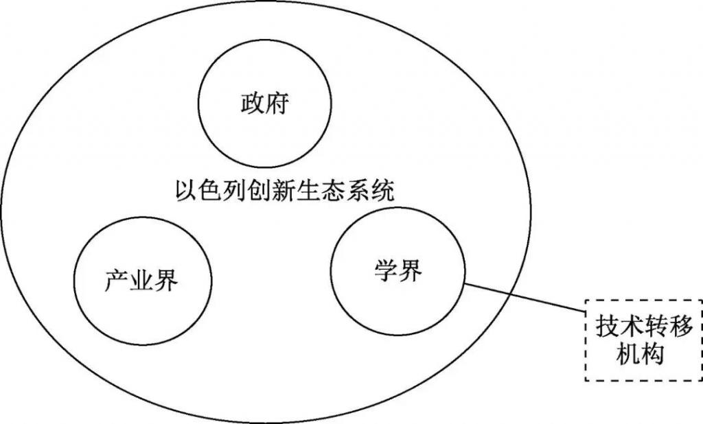 以色列国家创新生态系统主要由政府、学界、产业界(或私营部门)3 方面的要素构成。其中政府主要作用为出台支持创新的相关政策、颁布法律法规、进行资助等。产业界(私营部门)主要包括生产企业、风投公司、众筹平台以及提供服务的会计师事务所、律师事务所等。学界除了包括科技人力资源外,技术转移机构也是其中的重要组成部分。