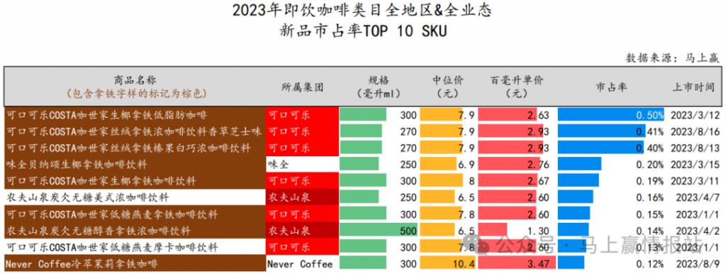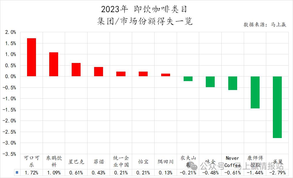 根据马上赢线下零售监测网络中的数据,2023 年,在即饮咖啡赛道,可口可乐公司市场份额增长 1.72%(目前可口可乐公司 " 官方 " 在华销售即饮咖啡品牌有且仅有 Costa 咖世家),显著领先于其他竞品。