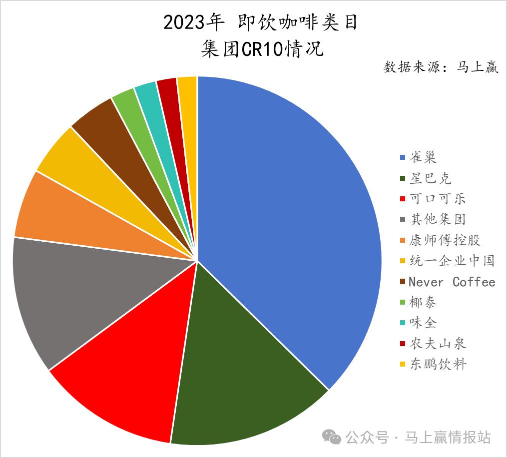 根据马上赢数据,在众多的饮料类目中,即饮咖啡在 2023 年的市场份额增速达到 7.1%,在 22 个四级类目中排名第四。在即饮咖啡类目分析中,首先是 CR10 的情况。