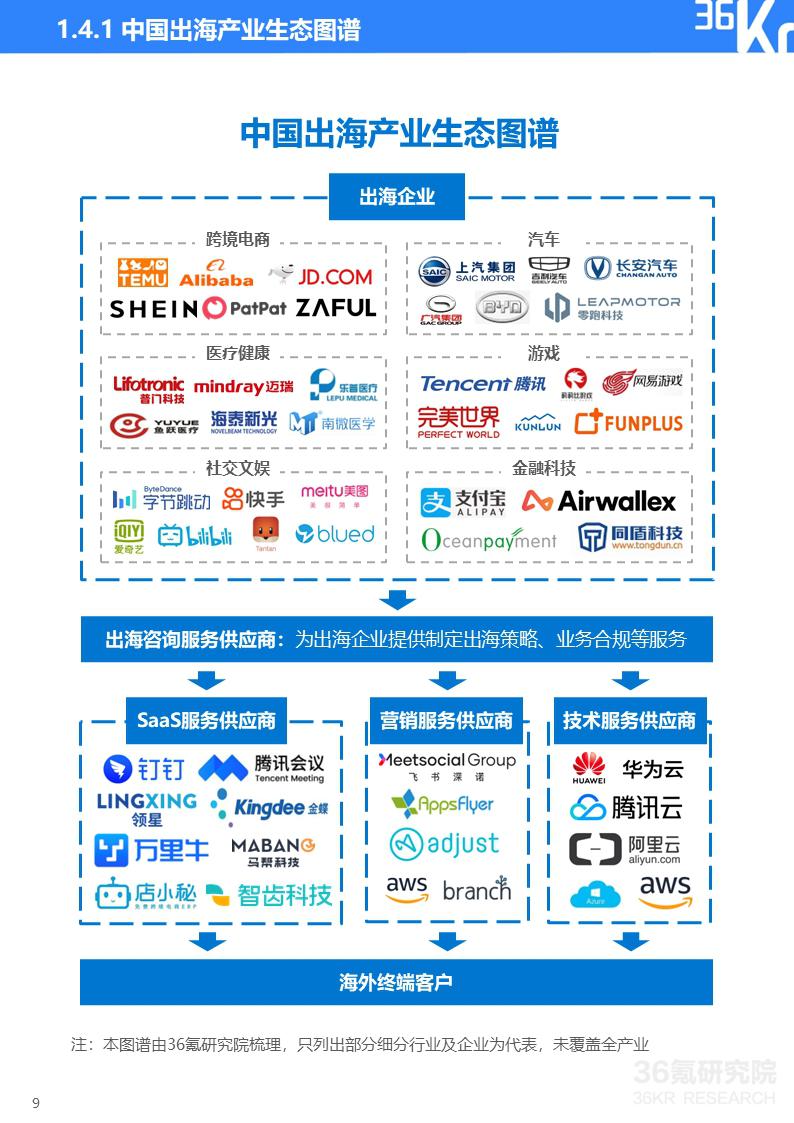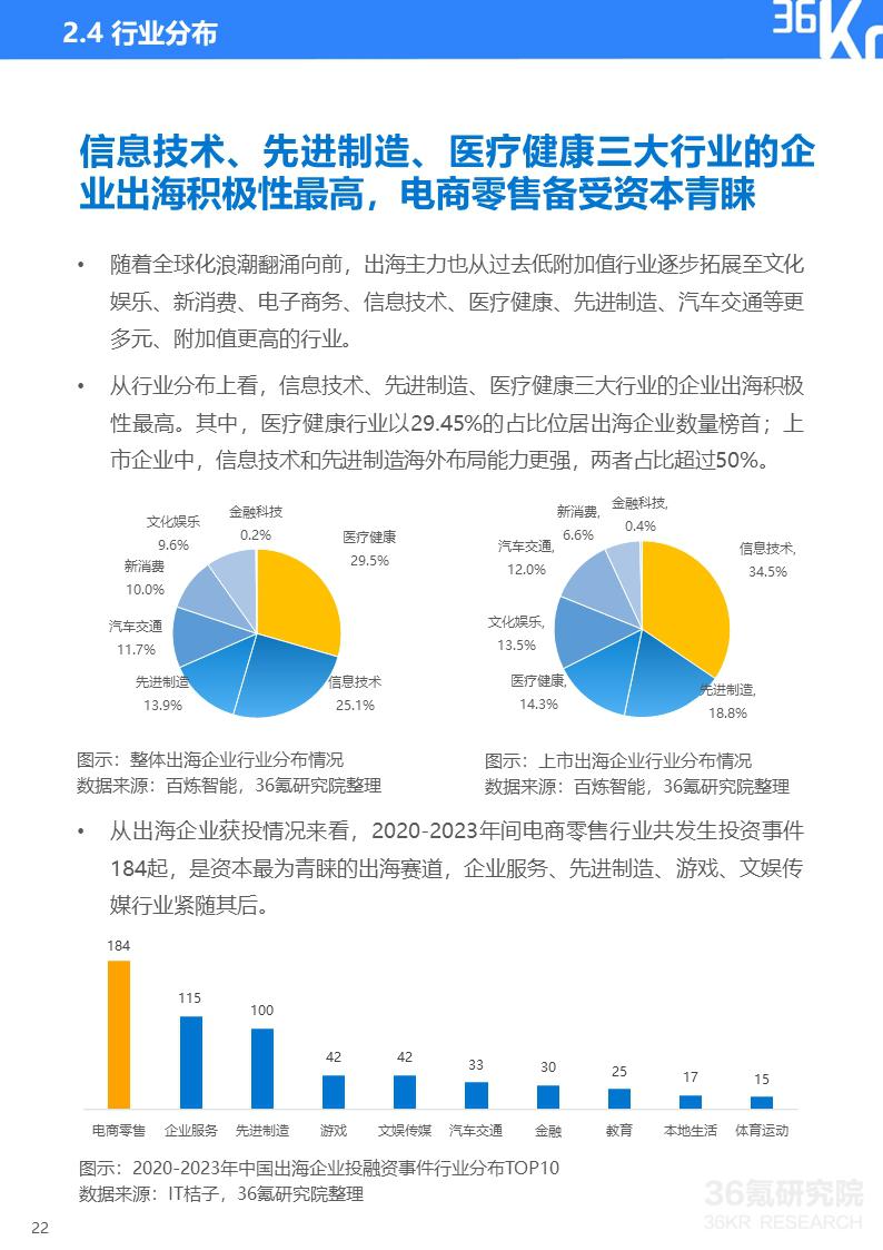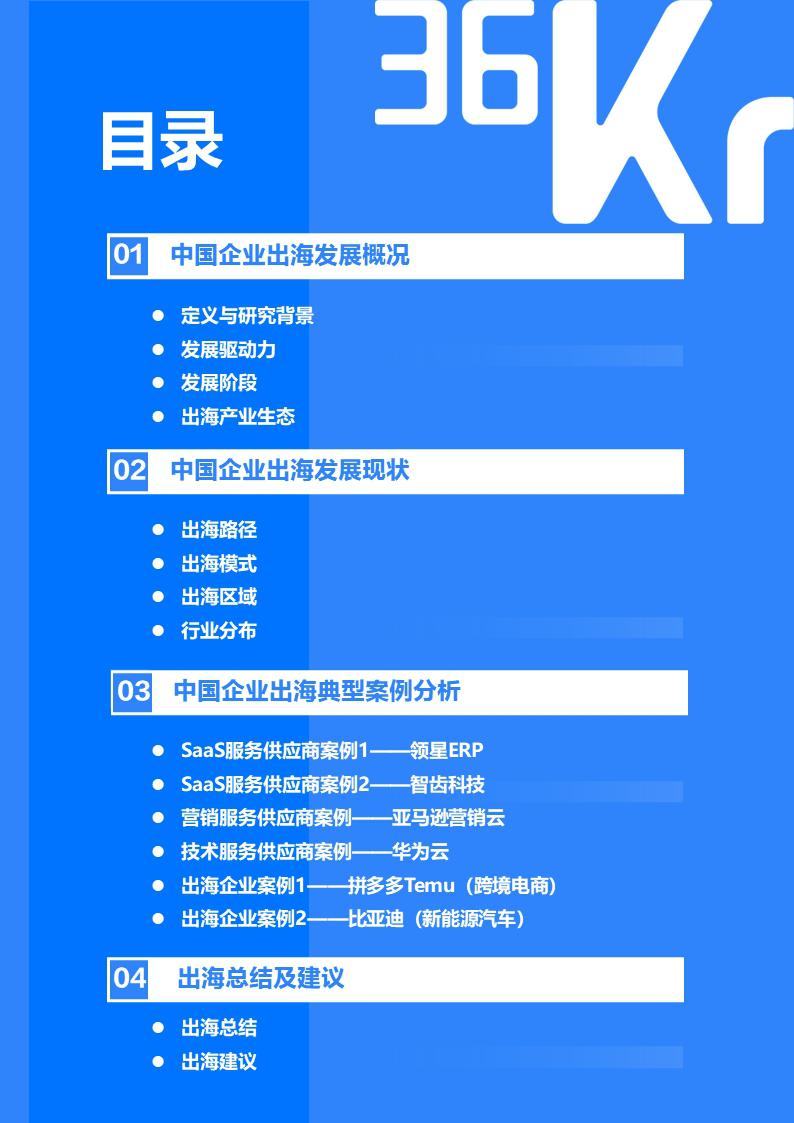 全球化时代,越来越多的中国企业将业务拓展至全球范围,出海也从 " 可选项 " 变为部分企业的 " 必选项 "。从中国品牌自主研发的新能源汽车,到加码国际化布局的医疗器械,再到文化输出的短视频,越来越多的中国企业正加速出海步伐。36 氪研究院持续关注出海赛道,基于 2023 年中国企业出海动态总结出海路径、出海区域、出海赛道等内容,输出面向 2024 年出海策略的深度研究,供已出海或潜在出海企业制定战略布局参考。