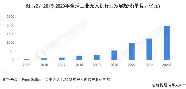 根据 Frost&Sullivan 的统计数据,全球工业级无人机的发展速度将超过军用、消费级等无人机的发展速度,成为刺激各国经济发展的一个重要产业。2015 年全球工业无人机的市场规模为 53.63 亿元,占全球民用无人机市场规模的 25%,随着无人机产业链及飞控与导航技术的成熟,工业级无人机产业得到了快速发展。此外,垂直起降固定翼无人机等工业级无人机产品产业化迅速发展,也推动了全球工业级无人机产业规模的增长,工业无人机在民用无人机中的比例逐渐扩大,2021 年全球工业无人机市场规模达到了 956.22 亿元,占全球民用无人机市场规模的 59.56%。根据中无人机 2022 年年度报告,2022 年全球民用无人机产业市场规模约 304 亿美元,比上年增长 15.6%。目前全球工业无人机市场规模占据民用无人机市场规模的 60%,以此测算 2022 年全球工业无人机市场规模达到 1226.84 亿元。前瞻根据工业无人的市场发展增速及前景,初步估计 2023 年全球工业无人机的市场规模或近 2000 亿元。未来几年,全球民用无人机市场规模仍将保持较快增长,其中工业无人机将成为民用无人机的发展热点,市场规模将快速增长。