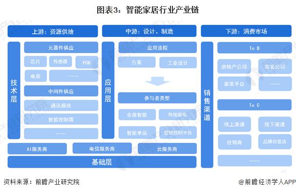 智能家居行业上游主要为技术层,包括元器件工业和中间件供应,其中元器件供应又包括芯片、传感器、PCB 和电容等 ; 中间件供应主要包括通讯模块、智能控制器等 ; 此外,行业上游还涉及基础层,包括 AI 技术、电信和云服务,而基础层也贯穿上游和中游。智能家居行业中游主要是智能家居设备制造和方案设计,参与者类型包括全屋智能解决商、传统家电厂商、智能单品制造商和管理控制平台厂商。下游消费市场可细分为 To B 端和 To C 端,To B 端涉及房地产公司、家装公司等 ;To C 端既包括线上渠道也包括线下渠道。