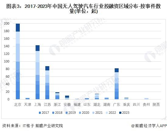 从总体上看,我国无人驾驶汽车行业的融资区域较为集中,主要分布在北京、上海、江苏、广东等地,其余省份分布相对较少。其中,融资事件数最多的地区是北京,2017-2023 年累计达到 200 起 ; 其次是上海,2017-2023 年共发生 143 起融资事件。