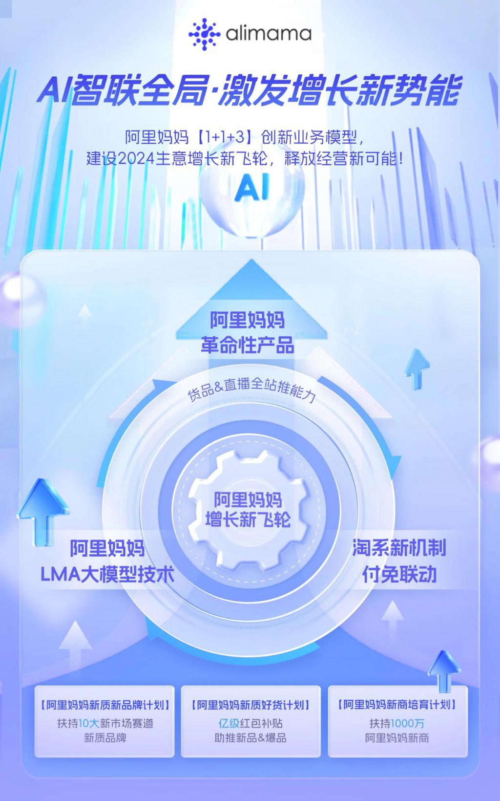 3 月 25 日,阿里妈妈正式发布"1+1+3 创新业务模型 ",即以"LMA 大模型技术 +1 个革命性产品 +3 大商家扶持计划 ",打造淘系增长新飞轮,希望通过 "AI 智联全局 ",激发新的增长势能。