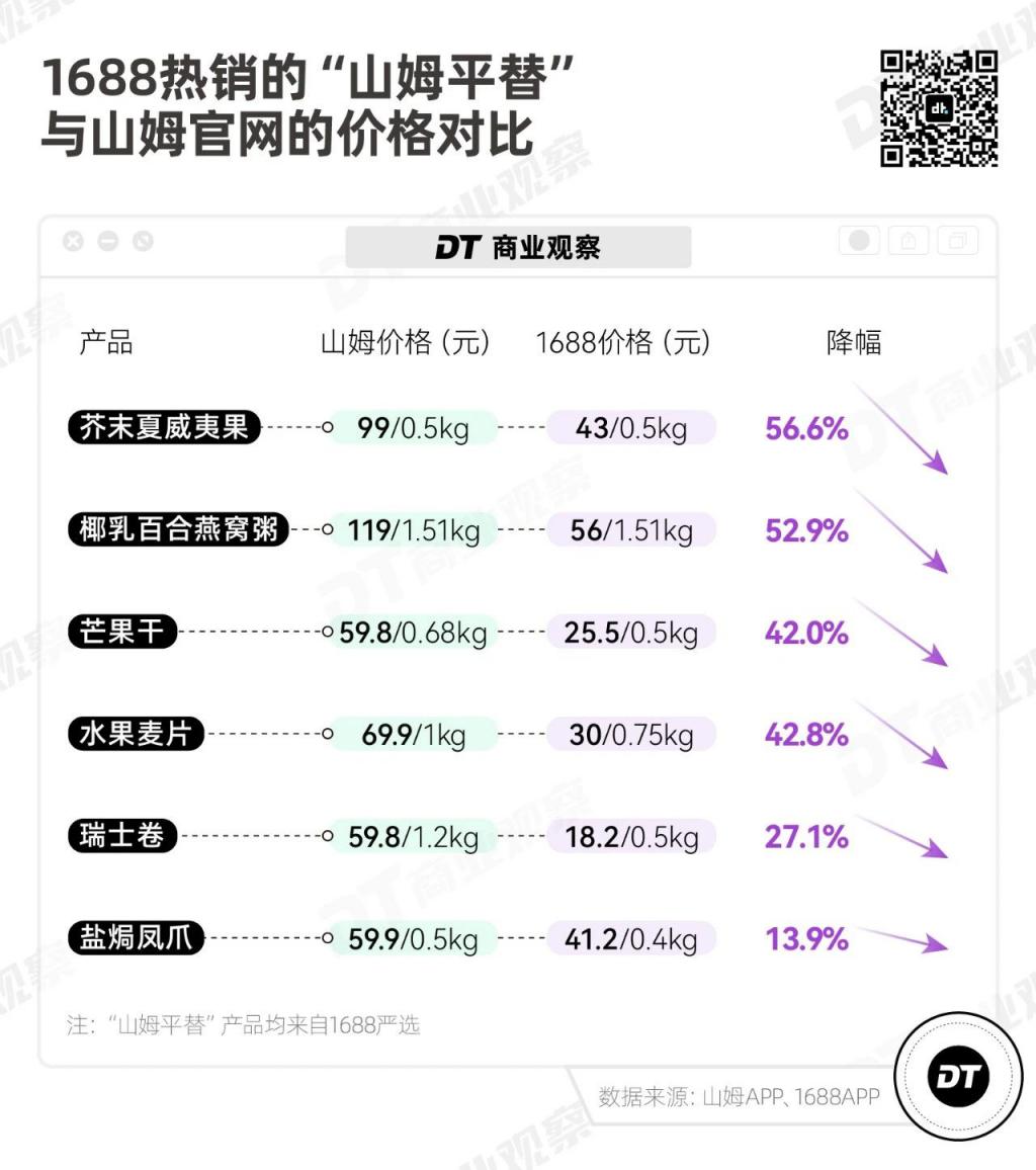 以 1688 的山姆零食平替为例,即使没有开会员卡,也能在 1688 上购买到划算的同款。比如其中一款芥末夏威夷果,在同等克重之下,平替的价格仅为原价的二分之一。