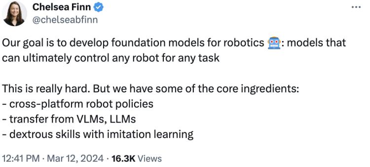 还记得曾火遍全网的 ALOHA 家务机器人吗?最近该项目导师,斯坦福计算机科学与电气工程系教授 Chelsea Finn 在 X 宣布,正式与其他几位伯克利大牛学者、谷歌 DeepMind 科学家共同创业,全力为机器人打造智能大脑。