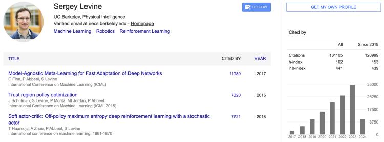 然而更令这个男人扬名立万的是他 " 学术狂魔 " 的名号。Sergey Levine 谷歌学术上被引用量超过 13 万,同时在顶级国际会议和期刊上发表过大量研究论文,接收量长期位居前列,并且经常霸榜。