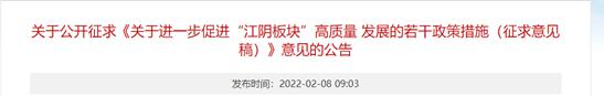 2022 年江阴政府推出了关于公开征求《关于进一步促进 " 江阴板块 " 高质量 发展的若干政策措施(征求意见稿)》意见的公告,指出为进一步深化金融供给侧结构性改革,着力打造以先进制造业为底色,战略性新兴产业为特色的 " 江阴板块 ",助力构建现代化产业体系建设,江阴市工业和信息化局组织起草了《关于进一步促进 " 江阴板块 " 高质量发展的若干政策措施(征求意见稿)》