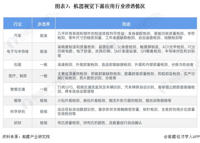 从下游应用渗透情况来看,中国机器视觉在汽车、电子与半导体应用市场的渗透率较高,包装、医疗、制药以及智能交通领域的渗透率一般,在烟草、纺织等其他行业的渗透率较低。