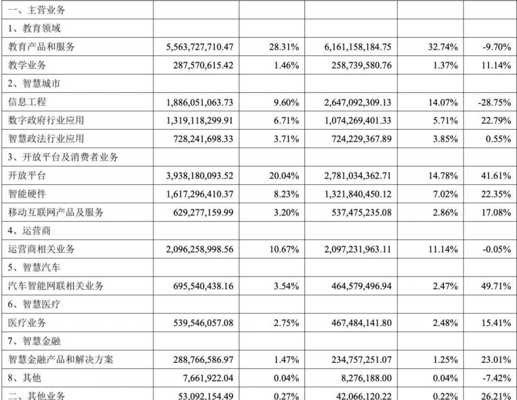 但对于科大讯飞的老业务(教育、智慧城市、运营商)而言,却呈现出了下滑迹象。2023 年,教育产品和服务收入同比下滑了 9.7%;智慧城市部分业务收入同比下滑了 28.75%;运营商业务下滑了 0.05%。