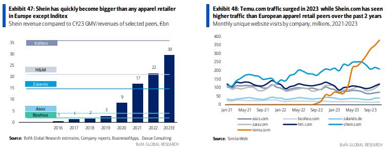 在 Shein 和 Temu 的冲击下,2023 年,Inditex、Hugo Boss 和 Primark(ABF)的营收呈中位数增长,在线快时尚零售商 ASOS 和 Boohoo 的销售额下滑了两位数,报告覆盖的其他大部分零售商均显示增长乏力。