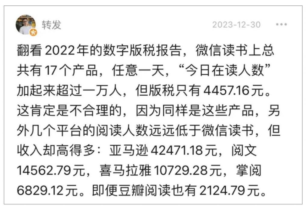 知名译者李继宏曾在豆瓣网晒出他 2022 年数字版税报告,他在拥有 2 亿多注册用户数的微信读书全年收益只有 4457.16 元,约为亚马逊(42471.18 元)的十分之一,计入阅文收入后也仅为 19000 元左右,不到亚马逊的一半。