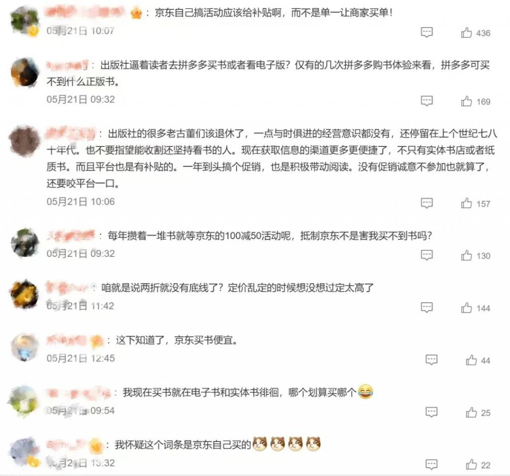 此外,频繁的低价促销也会导致消费者对图书价值的认知下降,认为 " 图书就应该是廉价的 ",这无疑更加剧了出版行业的生存困境。在此次抵制事件发酵后,也有不少用户发出类似的评论:" 每年攒着一堆书就等京东的 100 减 50 活动呢,抵制京东不是害我买不到书吗?"" 定价乱定的时候想没想过定太高了?"" 这下知道了,京东买书便宜。"" 我怀疑这个词条是京东自己买的。"" 实体书贵的离谱,还不让人家便宜呀。"