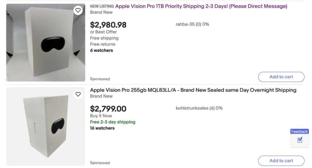 目前,美国二手平台 eBay 和 Swappa 上的 Vision Pro 价格普遍已经跌到 3000 美元以下,最低价格在 2799 美元左右(约 20325 元人民币),这还是在 Vision Pro 本身高达 3 万元的前提下。
