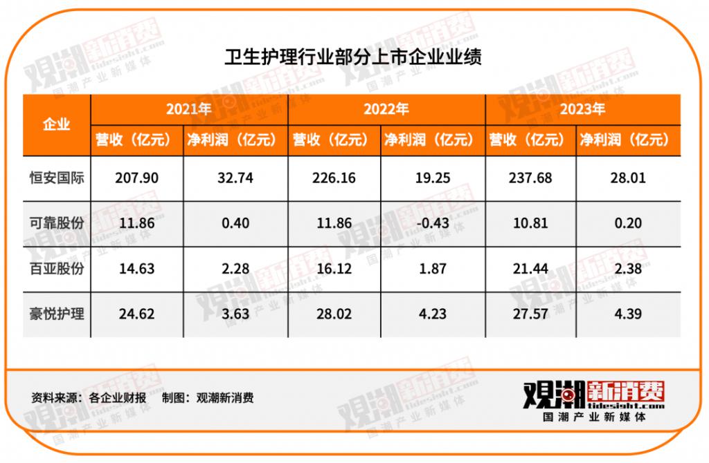行业竞争激烈,乃至巨头也面临着发展难题。恒安国际 2023 年实现营收 237.68 亿元,较上年增长仅 5.09%,增速逐渐放缓;可靠股份刚刚在 2023 年扭亏为盈,实现净利润 2018.49 万元;百亚股份业绩逐渐走高,但盈利能力大降;豪悦护理营收下滑,盈利放缓。