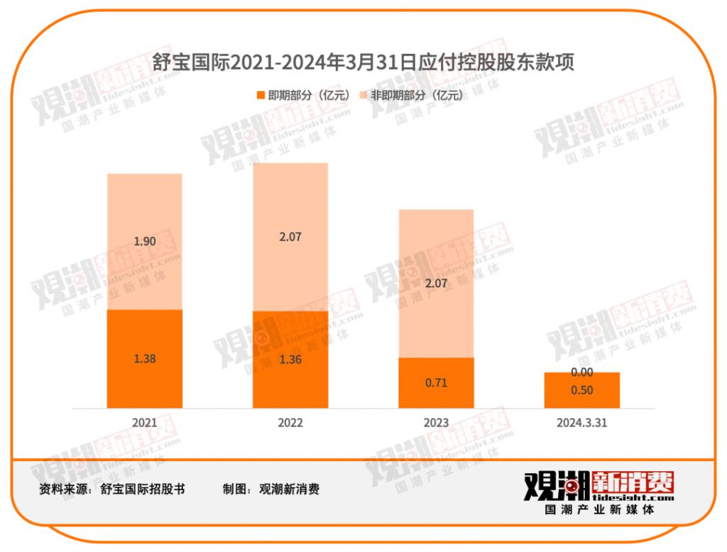 2021 年至 2024 年 3 月 31 日,舒宝国际应付控股股东款项分别约为 3.28 亿元、3.43 亿元、2.79 亿元和 5000 万元。截至 2024 年一季度,公司约 2.07 亿元的应付控股股东款项已被豁免,并于 2024 年 3 月 31 日计入权益项下的资本储备。