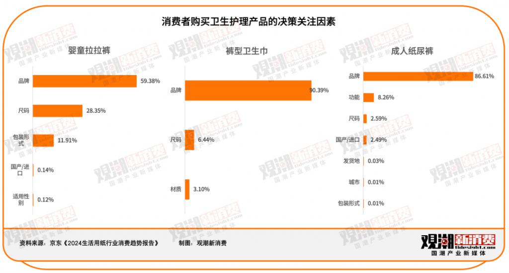 龙头承压,新品牌的破局也面临困境。根据京东《2024 生活用纸行业消费趋势报告》,不论是婴童护理、女性护理还是成人护理产品,品牌都是消费者最为主要的购物决策关注因素。