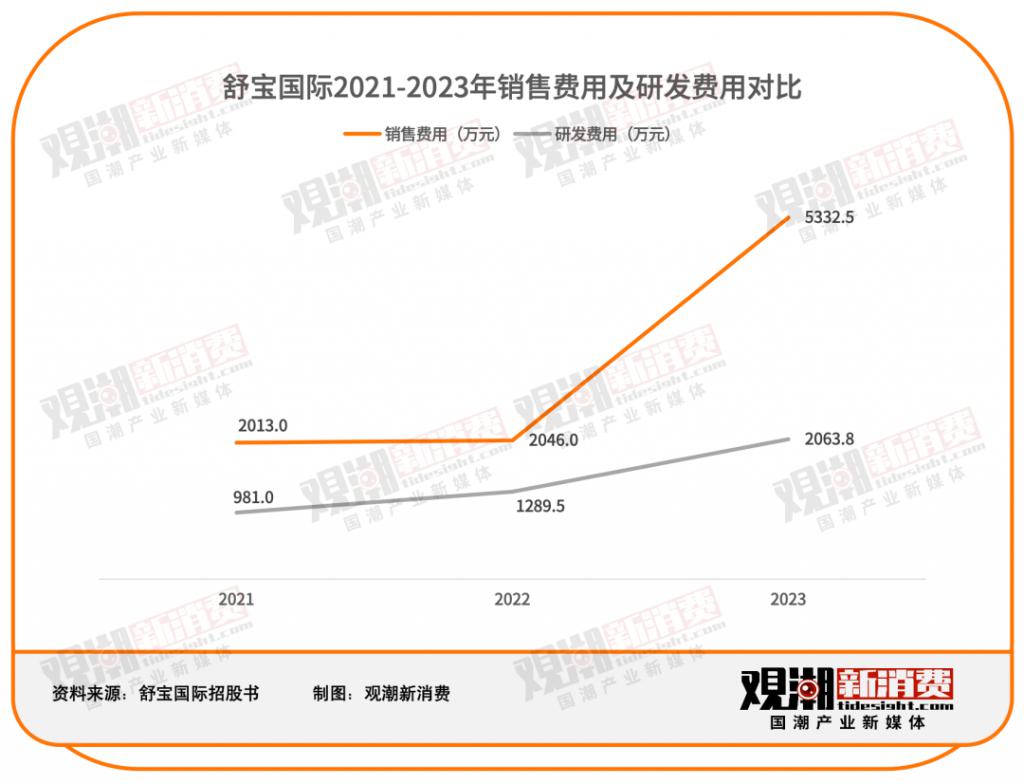 重营销轻研发的问题也显而易见。2023 年,舒宝国际线上销售及推广开支为 5332.5 万元,较上年增长约 136.9%。对比之下,企业 2023 年的研发开支占销售收入的比重仅为 3.2%。