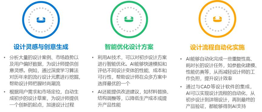 数字孪生:数字孪生技术通过对构建物理产品进行三维建模,使设计师在虚拟环境中实现产品外观设计和结构布局,并对产品性能进行模拟和测试,从而在产品实际生产之前发现问题并进行优化。AI 技术的融入,能够进一步增强数字孪生的智能化和自动化水平。AI 拥有强大的数据分析和学习能力,能够深入处理和分析海量的设计、生产及用户反馈数据,精准训练和优化数字孪生模型,使其更加真实地反映物理产品的实际情况。同时,AI 技术也赋予了数字孪生模型自适应调整的特性,让其能够随着环境和需求变化而自动更新,确保了设计的灵活性和快速响应。此外,AI 还在故障预测和产品质量管理方面发挥着关键作用,它通过分析历史故障数据来预测潜在问题,在设计阶段就采取相应的预防措施,延长产品寿命,降低维护成本。更重要的是,AI 技术的加持推动了数字孪生向更高层次的自动化迈进,实现了模型更新、数据分析和结果解读等过程的自动化,极大地减轻了设计师的工作负担,提高了整体工作效率。