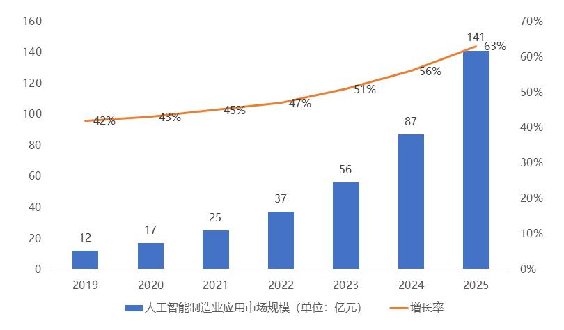 总体而言,人工智能在制造业具有广阔的应用空间。根据 Bizwit 数据,2023 年人工智能在中国制造业应用的市场规模约为 56 亿元,从 2019 年起,市场规模增长率将持续保持在 40% 以上,2025 年市场规模将达到 141 亿元。